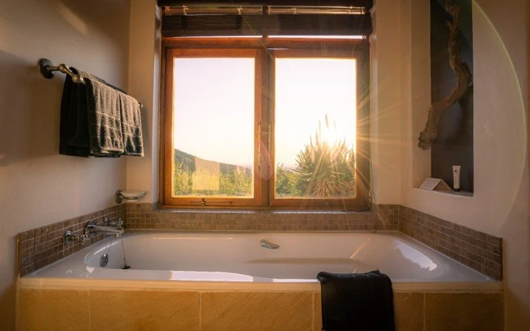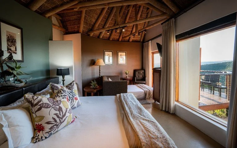 Kuzuko features 24 luxurious thatched chalets designed in a Karoo chic style and all located to maximise both views and privacy. Each 33m2 chalet consists of an open plan bedroom and living area that can be made up as two twin beds or one super king size bed, a lounge area that leads to your private deck, separate bathroom with a toilet, walk in shower, and a bath with a spectacular view. Additional amenities include a tea and coffee station, a minibar that can be stocked on request, safe, wardrobe, hairdryer, and free Wi-Fi.