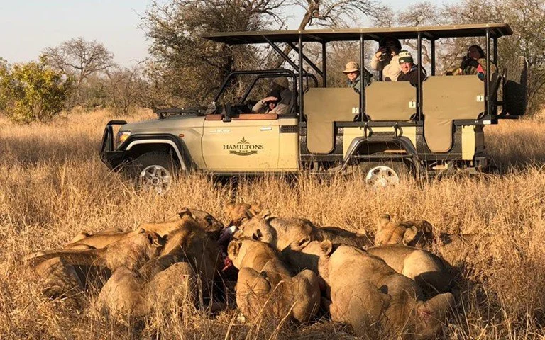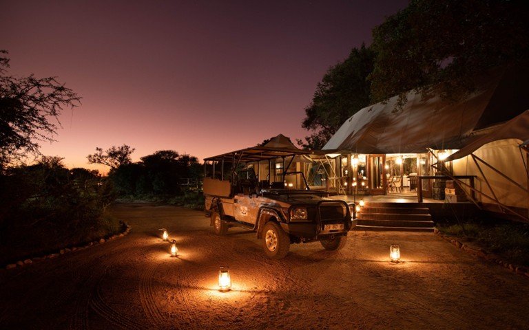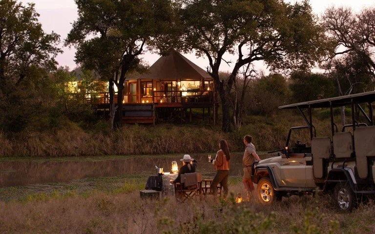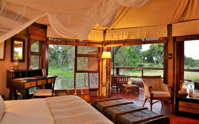 Hamiltons Tented Camp offers luxurious safari tents with private decks overlooking the Ngwenyeni Dam. Guests enjoy fine dining, guided bush walks, game drives, and a swimming pool. The camp combines modern comfort with a classic African safari experience.